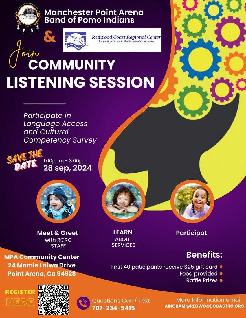 The Manchester Point Arena Band of Pomo Indians and the Redwood Coast Regional Center present “Community Listening Session” on Saturday, September 28, 2024 at the MPA Community Center,  24 Mamie Laiwa Dr., Point Arena, Ca 95468 –  from 1:00 pm- 3:00 pm.