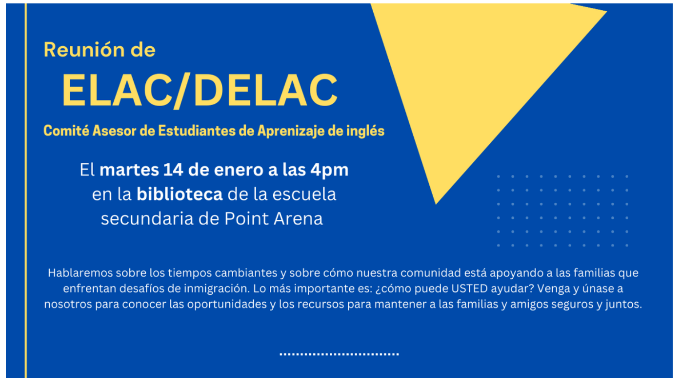 Point Arena Schools Families and Community Members, you are invited to a very important ELAC/DELAC meeting on Tuesday, January 14th at 4:00 in the Point Arena High School Library.