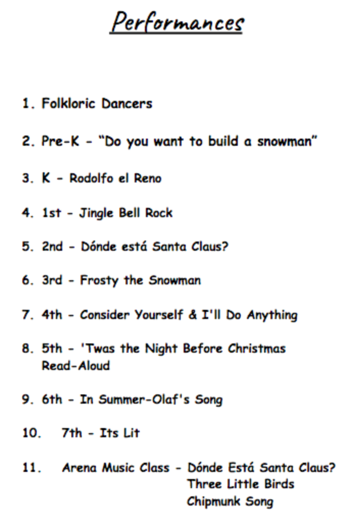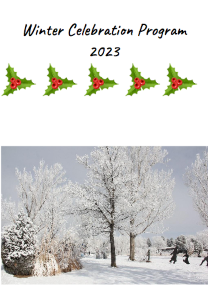 You are cordially invited to attend our annual winter celebration on Friday, December 22nd. Seating in the multipurpose room begins at 8:45 a.m. for the 9:00 a.m. performance.  The performance is about 2 hours long.  See the attached program.
