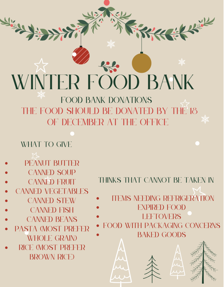 ASB Food Bank Donations December 11, 2024 blake88 Winter food bank donations should be in the PAHS office by Dec 18th. More information below
