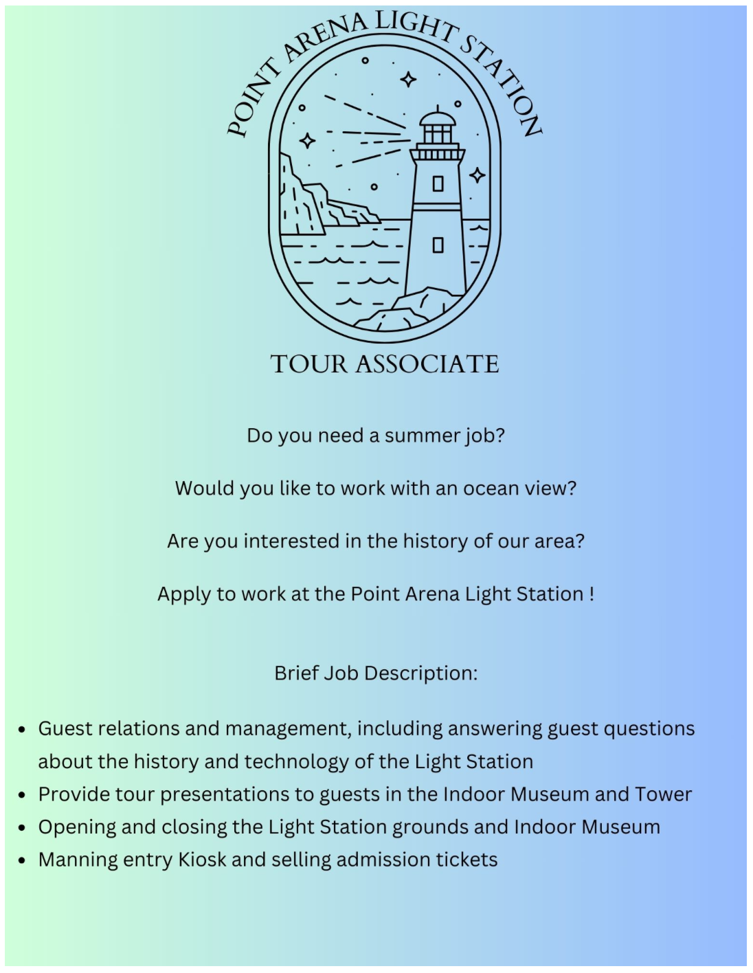 Summer Job Opportunity: Open to all High School Students: Point Arena Light Station: Tour Associate